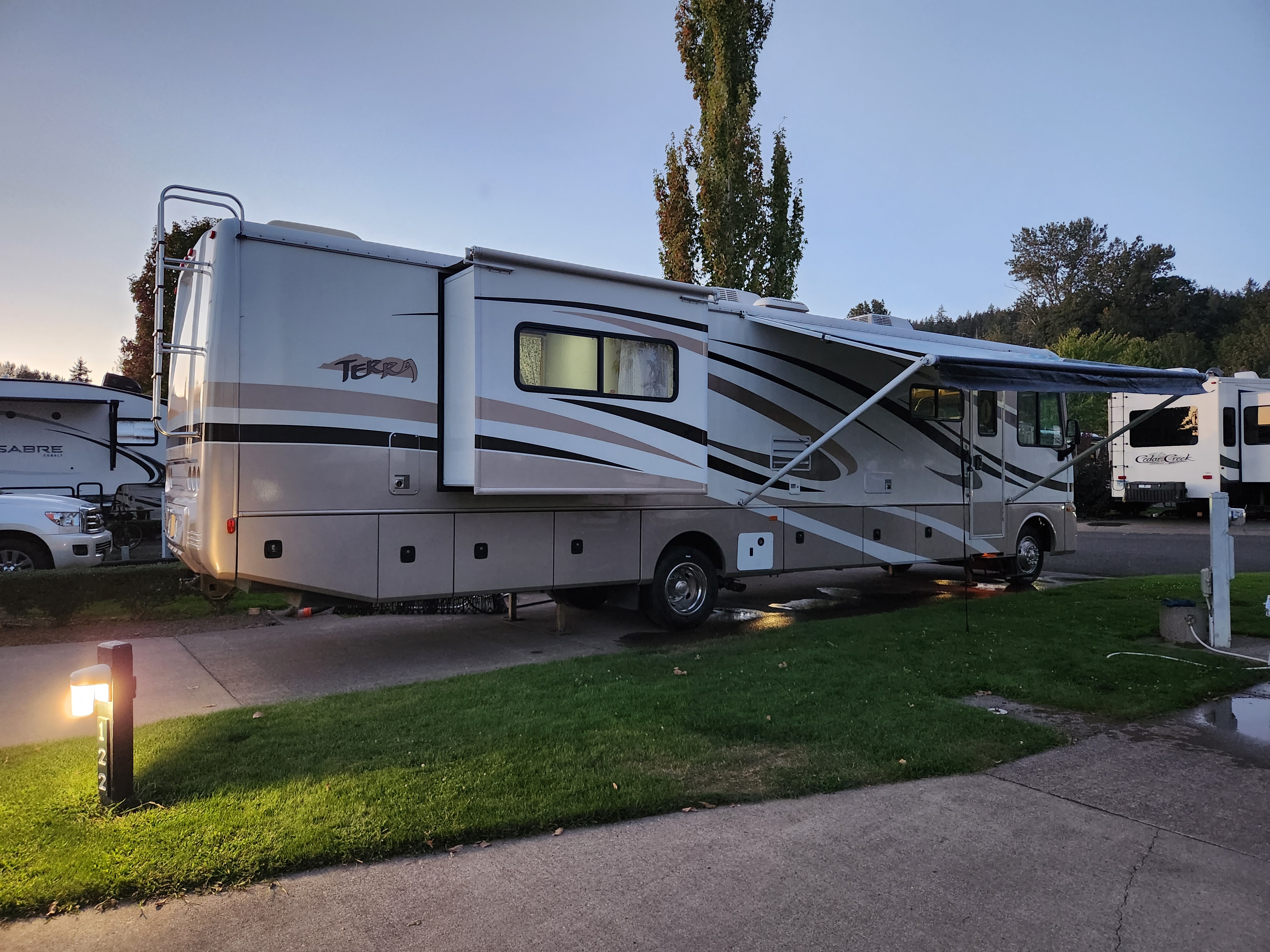 After going to a few dealers and actually test driving a few Class A models we liked, we encountered another issue. We didn't realize how challenging and strict RV Financing Terms were. For the model we wanted, we would have to put down a substantial down payment. It was practically like buying a home. My cousin gave me a pat on the shoulder, and we left the RV Dealer RV-less that day. But, it was a blessing in disguise. My cousin was the one who encouraged me to keep looking, and said, "now you know what you want, so go and find it, and you can get it much cheaper!" And he was right! I had scoured the internet for months, we went to see several motorhomes listed locally in my area, but didn't find one that feeled right for us. So, my cousin suggested I look at out of State listings. Facebook Marketplace was my friend and I consistently messaged private RV homeowners in other States. There was this one that I checked on weekly, and I built a good rapport with the owner who lived just outside of Portland. Even though we went to see dozens of RV's, my wife and I kept going back to this one. After months of messaging back and forth, we came to terms on a deal that made both of us happy. Below is the 2008 Fleetwood Terra 36.5T that we ended up purchasing from this amazing family in Oregon, who traveled in it for a year during the Pandemic. The best part is, we paid a 1/3 the price I would have paid at the Dealer (pretty much the down payment they requested) it was barely used with under 39K miles on it, new tires, new brakes, etc.